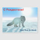 White on white. A digital painting of an Arctic Fox, Vulpes lagopus, on the polar ice. The sun hangs low in the bright blue arctic sky. Do not stare at the sun as it can harm your eyes. Cyrillic text reading "S Rozhdestvom" (С Рождеством - A Russian Christmas greeting) appears in red. Add your own additional text.