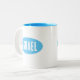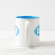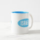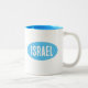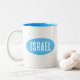 A light blue and white mug that says Israel. Mug design is inspired by the flag colours of Israel. עיצוב ספל קרמי