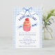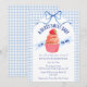 At the center of this baby shower invitation sits an adorable cupcake crowned with a sweet strawberry. A soft watercolor gingham backdrop and a delicately tied bow complete the look, creating a celebration that feels warm, whimsical, and beautifully inviting.
