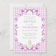This baptism invitation features a delicate watercolor candle marked with a small cross, softly framed by graceful scrolling flourishes. Set against a light watercolor gingham background, the design has a gentle vintage feel.