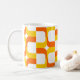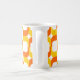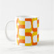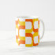 A bold geometric design made up of curved angle shapes in arranged in alternating directions with alternating colours.