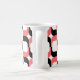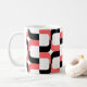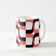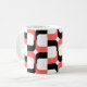 A bold geometric design made up of curved angle shapes in arranged in alternating directions with alternating colours.