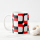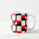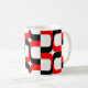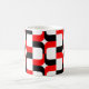 A bold geometric design made up of curved angle shapes in arranged in alternating directions with alternating colours.