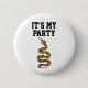 Personalised Birthday Snake Button tells everyone it's your day. Part of a fun and bold Brown and Gold snake design party supply set of 12,  essential for your wild themed party. Party on!