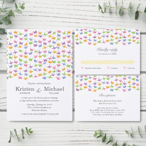 This wedding invitation collection features strings of pastel pretty origami paper cranes which makes it perfect for Asian themed celebrations. This is a nod to the ancient Japanese legend of folding 1,000 cranes for a thousand years of happiness and prosperity. Colours can be customised to suit your wedding's motif.