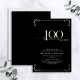 This beautiful invitation features hand lettered calligraphy artfully presenting 'one hundred' in luxurious hand lettering against a black background, adorned with delicate swirls in the corners top and bottom in real rose gold foil, along with the name and the number 100. This image will have all your guests excitedly anticipating your fabulous century festivities!