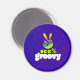 A funky cool magnet with a typography design containing a rainbow peace sign with fingers raised up in a V. Text says 100% groovy in a funky font. Psychedelic hippie theme design. Set on a dark toned acid purple colour background.