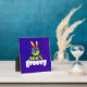 A trippy cool plaque with a typography design containing a rainbow peace sign with fingers raised up in a V. Text says 100% groovy in a funky font. Psychedelic hippie theme design. Set on a dark toned acid purple colour background.