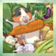 Display your business vegetarian or vegan credentials with this window cling; featuring a happy guinea pig reclining in a pile of vegetables, beneath a carrot with a nibbled message. Change the default "100% VEGGIE" text to your preferred caption. A cream, red and brown guinea pig in a sea of vegetables including cabbage, onions, celery, kidney beans, peas in pods, zucchini (uk courgette), eggplant (uk aubergine), garlic, potatoes, carrots, broccoli and cauliflower.