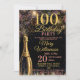 A stylish 100th birthday Party Invitation featuring a bottle of bubbly in gold, fireworks with gold and pink text all on a black background . A lovely design inviting your guests to join you for a 100th birthday party celebration. Easy to customize with your own party details. More text can be added on the back or delete the text box if not needed.