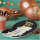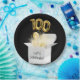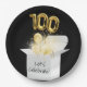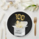 Gold balloons with sparkles and ribbons in a white box on black background for 100th birthday party.