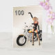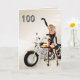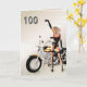 100th birthday with a motorbike. A girl standing next to a motorcycle pointing at the Happy Birthday message. The girl is waring heels and a basque. She is tall.slim and blonde. A great card for the man who loves his bikes!