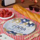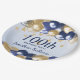A stylish 100th birthday paper plate . Design features navy blue and gold balloons, Gold glittery starts and navy blue text all on a pale blue gradient background. A lovely party table addition for a 100th birthday party celebration. Easy to customize with your own details.