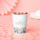 Elegant white rose and blue wildflower floral arrangement decorates the bottom of this 100th birthday party personalised paper cup. 100th is written in a modern script font. The remainder of the text is a spacious serif.