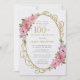 Elegant invitation choice for a 100th birthday celebration. An ornate gold frame frames the 100th birthday party details. The oval shape is very girly and feminine. Important details such as 100th birthday celebration and the celebrant's name are also in gold. The frame is decorated with very pretty pink roses nestled in deep green leaves. The back of the invitation is also pink. This birthday invitation is part of the Bella Rose 100th Birthday party collection. It contains more pretty elements such as return address labels, envelopes and envelope seals. There are also party supplies such as welcome signs and napkins. If you need help finding any item, please message me. I'm Nelda and I'd love to help.