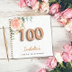 For an elegant and feminine 100th birthday party. A chic white background. Decorated with a rose gold and blush pink watercolored rose flower, floral, green eucalyptus leaves, sprigs, greenery and faux gold sprigs. Personalise and a name. Black and golden letters. The name is written with a modern hand lettered style script. Number 100 is written with a golden balloon style font. Can be used as a guest book or for planning the party.
