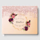 A Guest Book for a 100th birthday party. A chic golden and blush pink gradient background with a faux gold geometric frame. Decorated with dark purple and burgundy flowers, roses and boho style feathers. Rose gold faux glitter drips, paint drip look on the front and the back. Templates for a name, date and age 100. The name is written with a hand lettered style script. Black text. Date and age as curved text. Add your text on the spine.