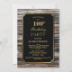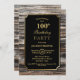 A rustic gold bordered wood 100th birthday party invitation with gold text on a black background.