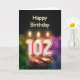 A birthday cake with candles. The candles are made up of the number 102, for a 102nd birthday. A birthday card suitable for everybody.
