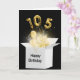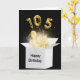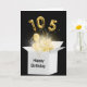 Gold balloons and sparkling light beams glow in a white box on black background for 105th birthday