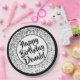 This modern over-the-hill design has a black and white random number pattern with a black milestone number 105 repeated in varied sizes and angles over a white background. There is a white circle in the centre for your text and black-and-white rings around the rim.
