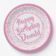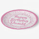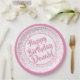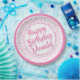 This modern over-the-hill design has a pink and white random number pattern with a pink milestone number 105 repeated in varied sizes and angles over a white background. There is a white circle in the centre for your text and pink-and-white rings around the rim.