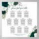 This stunning wedding seating chart includes 10 tables adorned with a rustic floral design featuring delicately hand-painted watercolor roses in shades of emerald green and sage, with accents of lush eucalyptus leaves and garden greenery. The layout accommodates up to 100 guests, with 10 seats available per table. The elegant script calligraphy title reads "please find your table" and the names of the couple and their wedding appear at the bottom. This seating chart is both aesthetically pleasing and functional, making it easy for guests to locate their designated seats while adding to the overall beauty of your wedding reception.