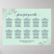 This seating chart will help your guests find their assigned tables at your wedding reception. The design is simple yet elegant with navy blue text on a light green or neo mint colored background. The title is written in beautiful script calligraphy lettering and reads: please find your table. Chic, pretty and sophisticated with lacy floral faux foil silver gray filigree in the corners. Contains seating assignments for 10 tables at 10 guests per table or 100 guests.