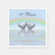 Napkins with my original design of two tin or aluminium hearts floating on the water under a rainbow. Customisable text says "10 Years".
