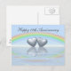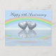 Postcard with my design of two tin or aluminium coloured hearts floating on the water under a rainbow. Customisable text says "10 Years".
