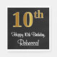 This sophisticated, luxurious, and elegant birthday-themed paper napkin design features a large ordinal number “10th” having an imitation/faux gold-inspired look, along with the birthday greeting message “Happy 10th Birthday,” and a custom name in a script-style font. The background is coloured black. Paper napkins like this might be used when celebrating somebody’s 10th birthday. [~Z0000516]