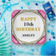 Happy Birthday is written in gold colour stencil font. For the 10th birthday girl or personalise for any age. Type in age and name in black text against white background. Four corners are pretty pink with the Age written in white text. Click Customise to change Triangle pink corners background via Fill Colour, or to increase or decrease Name font size. XO is in gold text in circular pattern. Original Design © TamiraZDesigns.