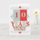 Bright and cheerful birthday card for any boy or girl about to turn ten-years-old in a trendy patterned style of red and aqua blue with hints of golden hues in a digital glitter look.