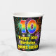 This joyful and fun birthday themed paper cup design features a large number “10” having a rainbow spectrum gradient inspired pattern. It also features the message “Happy 10th Birthday,”, and a customisable name. The background features a colourful pattern inspired by the look of bursting celebratory fireworks. Colourful, vibrant paper cups like this might be fun to use at a birthday celebration/party being held to honour somebody’s tenth birthday. [~Z0000539]