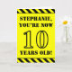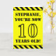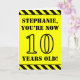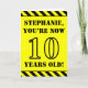 The front of this fun and attention-grabbing birthday themed greeting card design features a customisable name and the message "YOU’RE NOW 10 YEARS OLD!" in black stencil inspired text on a yellow coloured background. There is also an eye-catching black and yellow stripes pattern at the top and bottom edges of the front. The inside features a customisable birthday greeting message, or could perhaps be cleared and left blank if a message is to be written by hand instead. A customisable birthday card like this might be a fun way to acknowledge somebody’s tenth birthday. [~Z0000413]