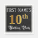 This luxurious and fancy birthday themed paper napkin design features a customisable name and the message “10th Birthday Party”. The large number “10th” has an imitation/faux gold-inspired colouring pattern, the words “Birthday Party” are in opulent script-style text, and the background is coloured black by default (although it can be customised). Elegant, ornate paper napkins like this might be useful to have at a birthday party/celebration being held in celebration of somebody’s 10th birthday. [~Z0000565]