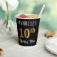 This opulent and elegant birthday paper cup design features a customisable name and the message “10th Birthday Party”. The large number “10th” has an imitation/faux gold-inspired colouring pattern, and the words “Birthday Party” are in fancy script-style text. The background is coloured black by default (although it can be customised). Ornate, fancy paper cups like this might be useful at a birthday party being held to celebrate somebody’s tenth birthday. [~Z0000567]