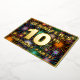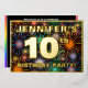 The front of this eye-catching tenth birthday party/celebration foil invitation card design features a personalised name, a large number “10th”, the message “BIRTHDAY PARTY!”, and a border. The background of the front features a bold, multicolored pattern that resembles bursting celebratory fireworks. The back features personalised details about the event, such as the date, time, venue/place, and any other information that may be useful. Customisable invitations like these might be a fun way to invite attendees/guests to a birthday party being held in celebration of somebody’s 10th birthday. [~Z0000602]