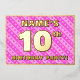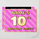 The front of this joyful tenth birthday party foil invitation card design features a personalised name, a large number “10th”, the message “BIRTHDAY PARTY!”, and a border. The background of the front has a fun light pink and dark pink striped pattern containing heart shapes. The back features personalised details about the event, such as the date, time, venue/place, and any other relevant information. Customisable invitations like these might be a fun way to invite attendees/guests to a birthday party/gathering being held to celebrate somebody’s 10th birthday. [~Z0000603]