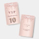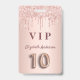A modern, stylish and glamourous badge for a girl's 10th birthday party. A faux rose gold metallic looking background with an elegant faux rose gold glitter drip, paint drip look. The name is written with a modern dark rose gold coloured hand lettered style script. With the text: VIP Number 10 is written with a balloon style font, script.
