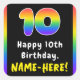 This joyful and vibrant birthday square sticker design features the number “10“ with a vibrant rainbow spectrum inspired gradient pattern, along with the message “Happy 10th Birthday,”, and a customizable recipient name. Stickers like these might be used when celebrating somebody’s 10th birthday. [~Z0000630]