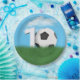 A black and white soccer ball in green grass, blue sky, and white fluffy clouds for a 10th birthday party.