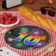This fun, cheerful, and colourful paper plate design features a large number "10" having a rainbow spectrum gradient inspired pattern colouring. It also features a vibrant and exciting bursting celebratory fireworks inspired pattern. The background is coloured black. Fun paper plates like this might be used at a celebration being held in honour of somebody’s tenth birthday, a tenth anniversary, or some other 10th event. [~Z0000490]