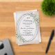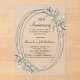 A frosted, transparent background. Decorated with greenery and an oval frame. Personalise and add a name and details.