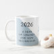 2026 Universal Year of Change and New Beginnings Motivational Quote Coffee Mug - Resolution Number 11... In Numerology, the year 2026 is a "Universal One Year" with the numbers (2+0+2+6) adding up to 10, which reduces down to 1. The number One represents change, new beginnings, originality, and new understandings, personally and globally. Some of us welcome change; others fear it, resist it, and attempt to stop it from happening, whether on a personal, nationwide, or global level. My aim with this collection of motivational mugs is to help you set your intentions (or New Year's Resolutions) for 2026 to ease the way during the chaos that can occur when major changes are taking place both within you and all over the world at the same time. Overlaid on geometric shapes in a lovely light dusty blue color, the text on one side of the mug reads "2026 A year of change and new beginnings" with the intention on the other side "This is the year I will set strong intentions that I commit to fearlessly". You can revise this text, if you like, and also personalize the mug with your name and monogram initial by selecting "Details" where it says "Personalize this template". The intention text is adapted from an original saying by Barbara Casey.
