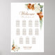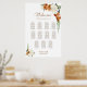 Help your guests find their table with this burnt orange and white rose floral wedding seating chart. It is suitable for a wedding with 11 tables and 110 guests.