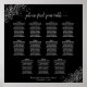 This 11 table seating chart is both simple and elegant with pale gray text on a black background. The design features a lacy script calligraphy title with decorative frilly silver faux foil filigree in the corners. Stylish, chic and sophisticated way to help your guests find their seats at your wedding reception. It includes table assignments for 110 guests with 10 seats per table.