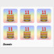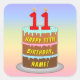This upbeat and colourful birthday square sticker design features a cartoon-style depiction of a three-tier birthday cake having number-shaped candles on top showing the age “11“, along with the message “HAPPY 11TH BIRTHDAY,”, and an editable recipient name. The background has a multi-colour pastel rainbow spectrum inspired gradient pattern. Stickers like these might be used or distributed at a birthday party held in celebration of somebody’s 11th birthday, or perhaps used when preparing invitations or wrapping gifts/presents for such an event. [~Z0000624]