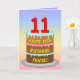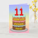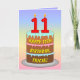 This joyful and fun birthday greeting card design features a cartoon-style depiction of a three-tier birthday cake having numeral-shaped candles on top showing the number “11“, along with the message “HAPPY 11TH BIRTHDAY,”, and an editable recipient name. The background of the front features a multicolored pastel rainbow spectrum inspired gradient pattern. The inside features a customised birthday greeting message, or could perhaps be cleared and left blank if a message is to be written by hand instead. An upbeat, customised birthday greeting card like this might be a fun way to send some birthday wishes to somebody who is celebrating their eleventh birthday. [~Z0000625]