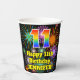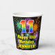 This colourful and exciting birthday paper cup design features a large number “11” having a rainbow spectrum gradient inspired pattern. It also features the message “Happy 11th Birthday,”, and a personalised name. The background features a vibrant and colourful pattern inspired by bursting celebratory fireworks. Colourful, vibrant paper cups like this might be fun to have at a birthday celebration being held in celebration of somebody’s eleventh birthday. [~Z0000539]
